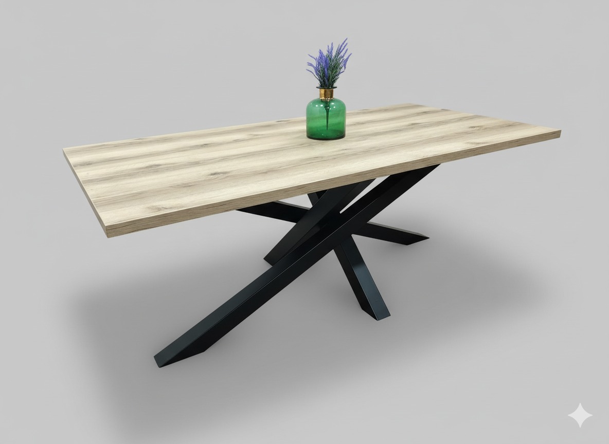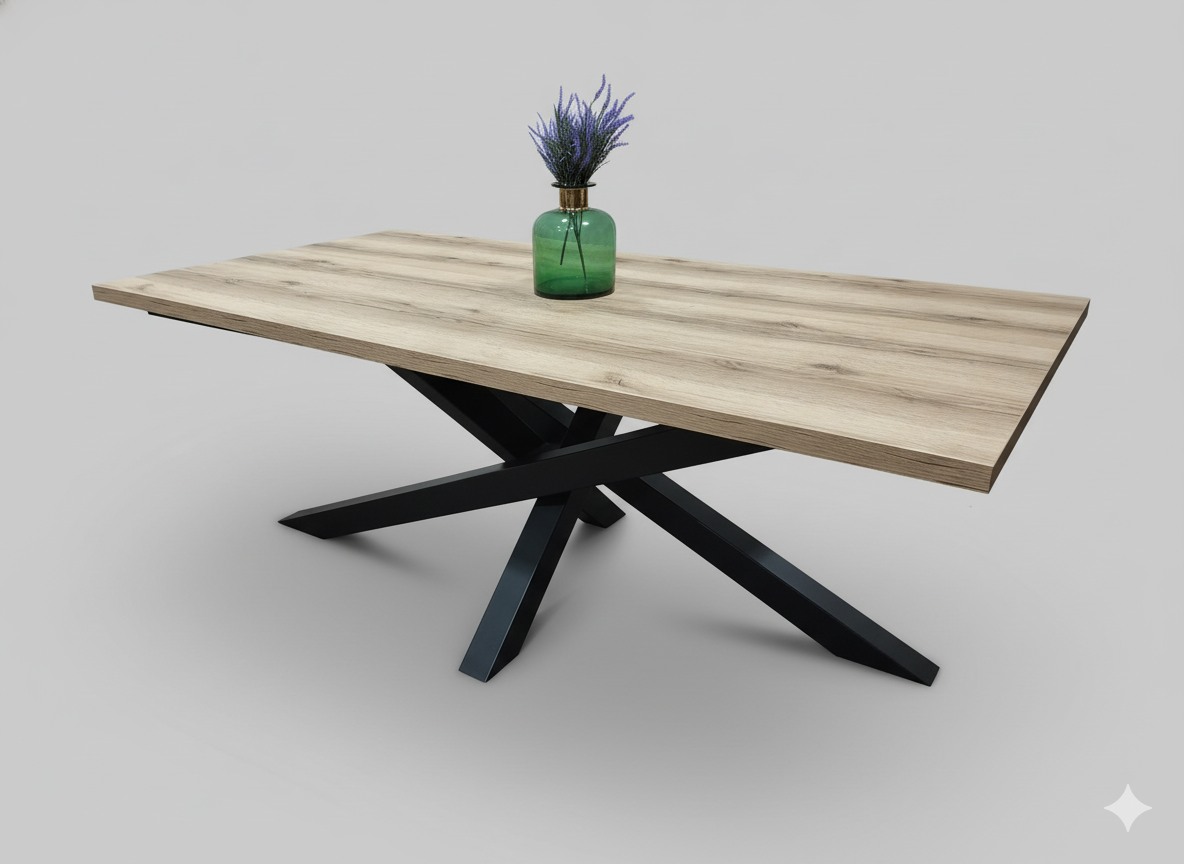 Stół Pająk to połączenie industrialnego designu z eleganckim wykończeniem. Solidny blat wykonany z wysokiej jakości płyty o strukturze naturalnego drewna nadaje wnętrzu ciepła i przytulności. Charakterystyczne metalowe nogi w kształcie pająka tworzą efektowną, geometryczną podstawę, która gwarantuje stabilność i wyjątkowy wygląd mebla.